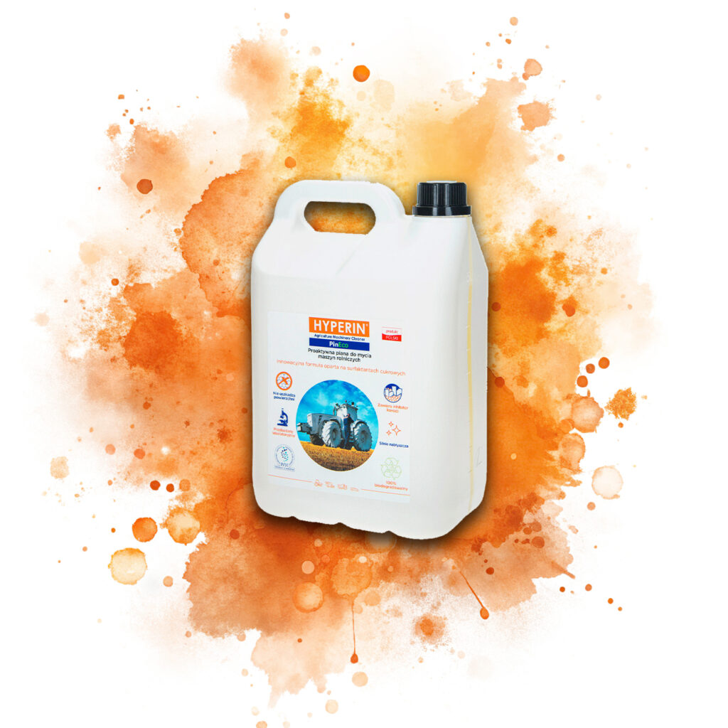 Szukasz bezpiecznego, skutecznego i w 100% biodegradowalnego środka do mycia maszyn rolniczych? Hyperin PinEco to innowacyjna piana aktywna oparta na naturalnych surfaktantach cukrowych, która usuwa najtrudniejsze zabrudzenia bez szkody dla środowiska, ludzi i sprzętu. Certyfikowana przez Narodowy Instytut Zdrowia Publicznego (PZH) gwarantuje bezpieczeństwo użytkowania nawet na powierzchniach mających kontakt z żywnością.