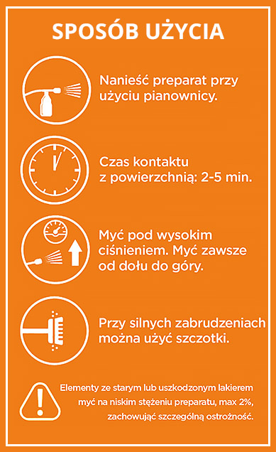 Płyn myjący w formie cieczy roboczej wlewamy do pianownicy. Następnie nanosimy pianę dokładnie na zabrudzoną powierzchnię. Mycie przeprowadzamy po odczekaniu 1-2minut, za pomocą myjki wysokociśnieniowej, kierując się od dołu do góry maszyny. Spłukiwanie przeprowadzamy w kierunku odwrotnym. Po zastosowaniu powierzchnie mające kontakt z żywnością spłukać wodą o jakości spożywczej. W przypadku dużych zabrudzeń można wspomagać się szczotką lub gąbką.