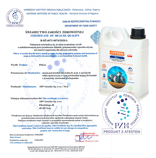 19 czerwca 2020 roku ekologiczna, proaktywna piana do mycia maszyn i urządzeń rolniczych – Hyperin PinEco, otrzymała świadectwo jakości zdrowotnej. Certyfikat przyznany przez Narodowy Instytut Zdrowia Publicznego PZH. Świadectwo potwierdza, że produkt marki Hyperin został przebadany laboratoryjnie i nie stanowi zagrożenia dla człowieka, a także może być używany na powierzchniach mających kontakt z żywnością.