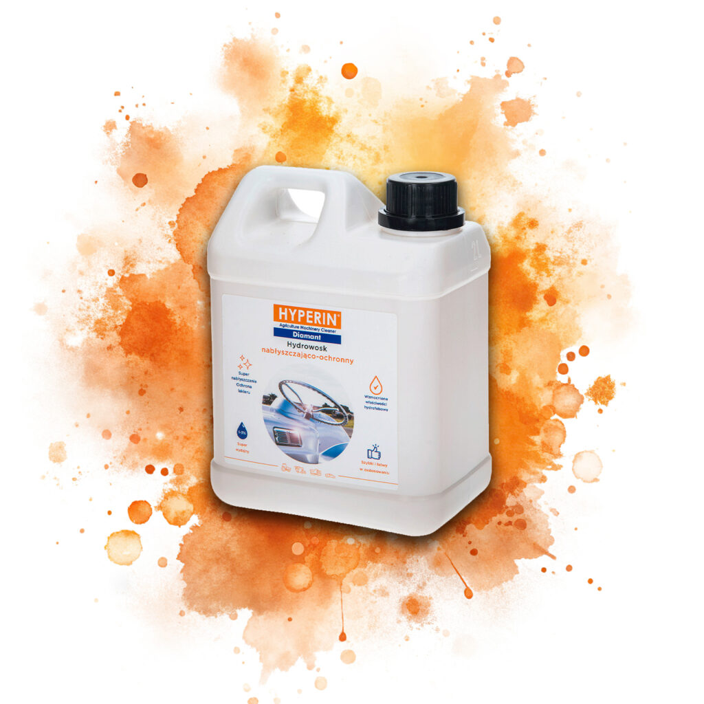 Koncentrat Hyperin Diamant to hydro wosk o właściwościach hydrofobowych. Stworzony, aby dokładnie zabezpieczyć, nadać wysokie nabłyszczenie, a także pozwolić na szybsze osuszenie elementów lakierowanych maszyn rolniczych. Daje możliwość wykorzystania go w sposób niewymagający dużych nakładów pracy oraz czasu.
