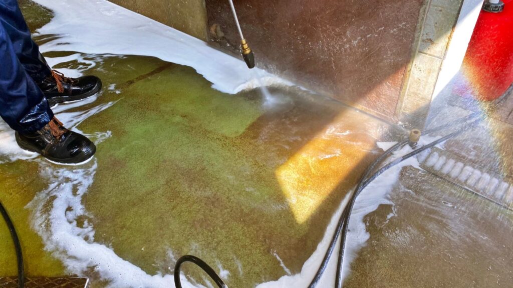 - Przy pomocy myjki ciśnieniowej myć powierzchnię od dołu do góry.