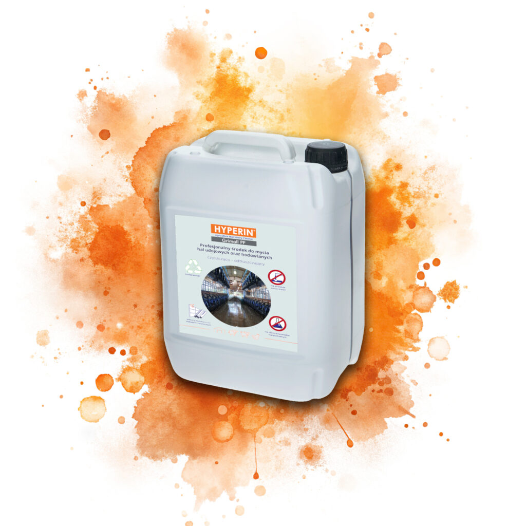 Hyperin Grimall PF to wysokoskoncentrowany, neutralny środek do mycia hal udojowych oraz hodowlanych. Stworzony do usuwania tłuszczy zwierzęcych z wszelkich powierzchni zmywalnych, również tych mających kontakt z żywnością oraz środkami żywienia zwierząt.