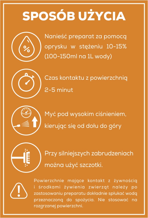 Ważnym aspektem jest naniesienie cieczy roboczej metodą opryskową i pozostawienie jej na powierzchni na około 2-5 minut. Następnie zmycie zabrudzeń przy pomocy myjki ciśnieniowej. Na powierzchniach pionowych zmywać złogi od dołu do góry.