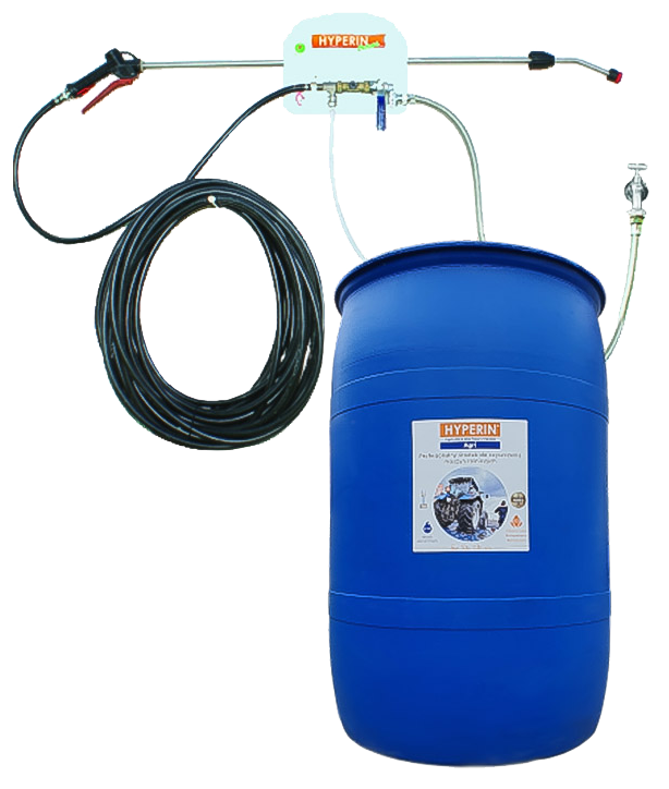 To specjalny automat dozujący, który składa się z pistoletu na szybko-złącze, inżektora, lancy ze stali nierdzewnej, zbrojonego węża 25m. długości. Całość podłączamy do źródła wody i beczki z preparatem do mycia sprzętu rolniczego Hyperin Agri.